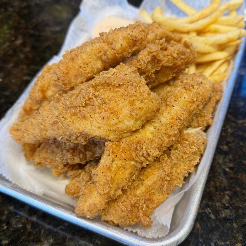 A tender lover’s dream—six chicken tenders, marinated for 24 hours, hand-breaded in our house seasoning, and fried to perfection in flavorful beef tallow. Served with crispy fries—regular or Cajun—and warm, golden hush puppies. dip ‘em in your favorite flavor: lemon pepper sauce, Buffalo, hot honey, honey BBQ, or Atlanta.